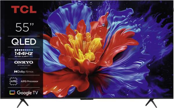 140 cm LED-Fernseher, 55 Zoll, Auflösung: 3.840×2.160 Pixel, 4K Ultra HD, 4K AI Upscaling, H.265 HEVC, HVA-Panel, Quad Core Prozessor, QLED-Technologie, Direct LED-Backlight, High Dynamic Range (HDR 10), High Dynamic Range (HDR 10+), Hybrid Log Gamma (HLG), Dolby Vision, 144 Hz Bildwiederholungsrate, Motion Clarity Pro, DVB-T2, DVB-S2, DVB-C, 2.1 Soundsystem, Dolby Atmos, 35 Watt maximale Gesamtleistung, integrierte Soundbar, Remote App kompatibel für iPhone, Android, per App steuerbar, integrierte Sprachsteuerung, kompatibel mit Amazon Alexa, Apple HomeKit, Google Assistant, Internet-Zugriff auf Online-Dienste, SmartTV, Google TV-Betriebssystem, Hands-free Voice Search, Spielemodus mit Freesync-Unterstützung, Google Cast (Übertragung von Inhalten vom Smartphone oder Tablet auf den Fernseher), Miracast (Drahtlose Bildübertragung vom Smartphone oder Tablet auf den Fernseher), WLAN, WiFi 5