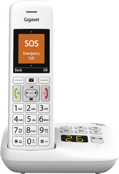 Festnetz-Telefon (für analogen Anschluß), strahlungsarm, schnurlos, DECT, GAP-kompatibel, Display 6-zeilig, alphanumerisch, farbig, graphisch, beleuchtet, Breite x Höhe: 3,5×4,4 cm, 5,8 cm Diagonale, Telefonbuchfunktion, bis 200 Nummernspeicher, Anruferliste, CLIP-Funktion, Freisprecheinrichtung, Hörgeräte kompatibel, Notruf-Funktion, Raumüberwachung (Babyfon-Funktion ), Wandmontage fähig, Tastatursperre, ca. 320 Stunden Standby-Zeit